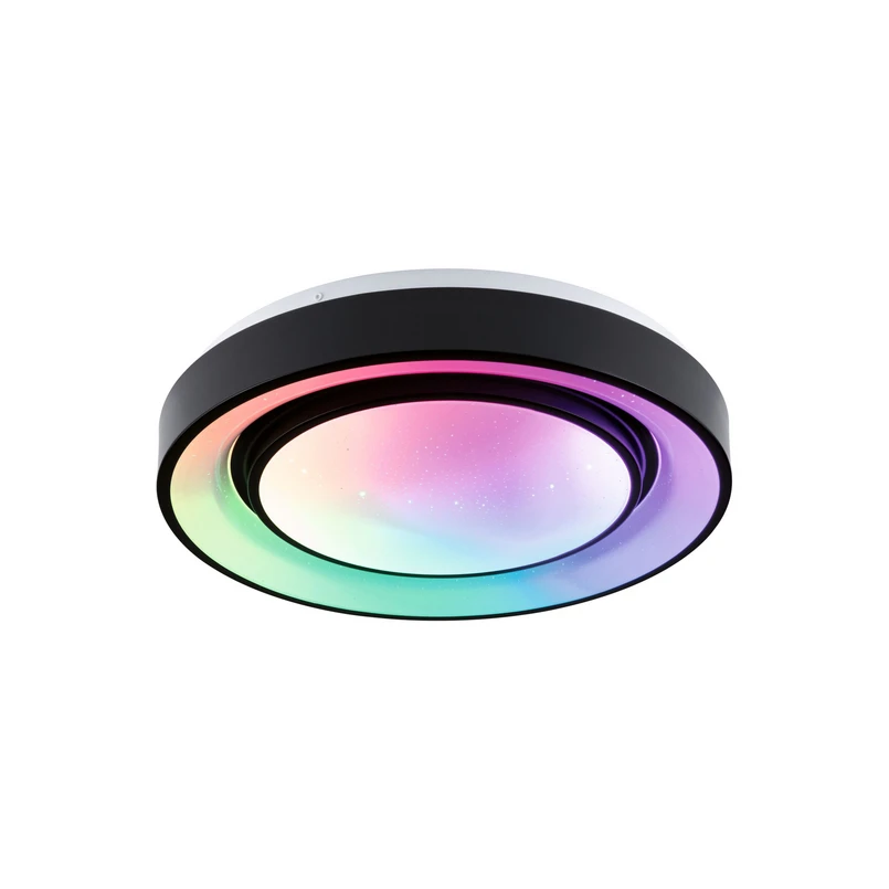Mit der Paulmann Rainbow LED-Deckenleuchte erlebt man Zuhause einzigartige Lichtmomente! Mit einem Durchmesser von 37,5 cm und einem modernen schwarzen Design fügt sich die Deckenleuchte perfekt in jeden Raum ein. Die integrierte LED-Lichtquelle sorgt für ein vielseitig einstellbares Licht und die CCT-Funktion sowie die RGB-Funktion ermöglichen eine individuelle Lichtfarbauswahl. Darüber hinaus lassen sich dreifarbige Lichtkombinationen sowie statische oder rotierende, dynamische Regenbogenfarben einstellen.