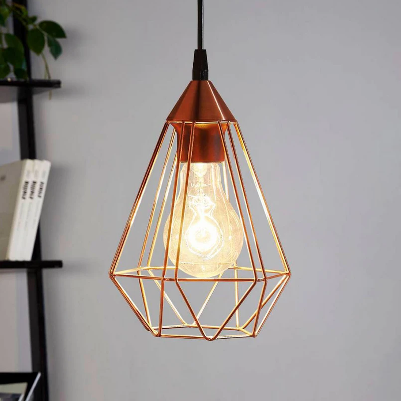 Die einflammige Hängeleuchte Tarbes im Vintagelook lässt sich zur Beleuchtung eines Beistelltischs in vielen Wohnstilen nutzen. Durch den offen im Käfigdesign gestalteten Schirm aus kupferfarbenen Metallstreben kann das Licht des eingesetzten Leuchtmittels (nicht enthalten) in alle Richtungen ungehindert strahlen, lediglich die Streben zeichnen sich durch feine Schatten in der Umgebung ab. Sehr dekorativ wirkt ein Leuchtmittel mit klarem Glaskolben und in Filamentoptik.