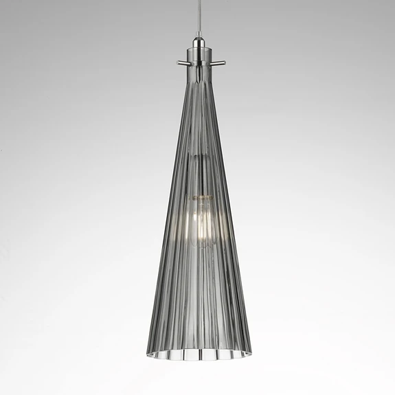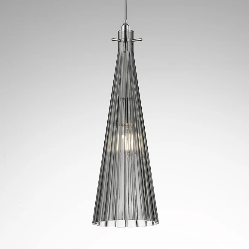 Die Pendelleuchte Costa Rica wird in Italien hergestellt und überzeugt mit einem eleganten und gleichzeitig modernen Design. Der geriffelte Schirm hat eine schlanke Trichterform und ist aus mundgeblasenem Glas gefertigt. Das Glas sorgt für eine weiche Lichtverteilung, die im gesamten Raum eine behagliche Atmosphäre erzeugt. Der Leuchtenschirm ist an einer Halterung aus nickelfarbenem Metall angebracht, die von dem Glas verdeckt wird.
