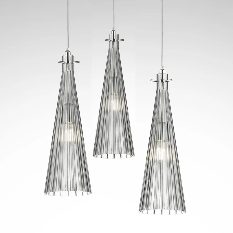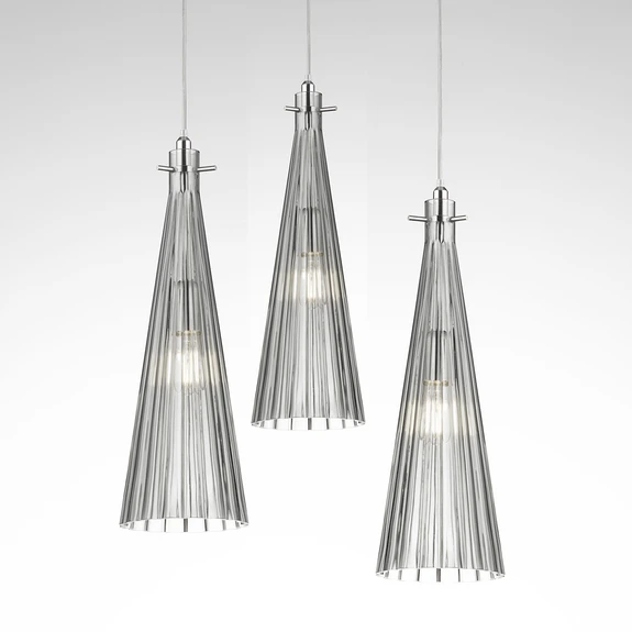 Die Leuchte besteht aus drei trichterförmigen Schirmen aus mundgeblasenem Glas. Das Glas blendet das Licht der Leuchtmittel ab und sorgt mit der geriffelten Beschaffenheit für ein ansprechendes Lichtspiel. Die Schirme sind an einem runden Baldachin aus Metall angebracht und hängen auf verschiedenen Höhen, wodurch der Pendelleuchte eine interessante Asymmetrie verliehen wird.
