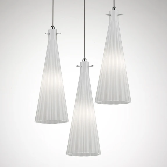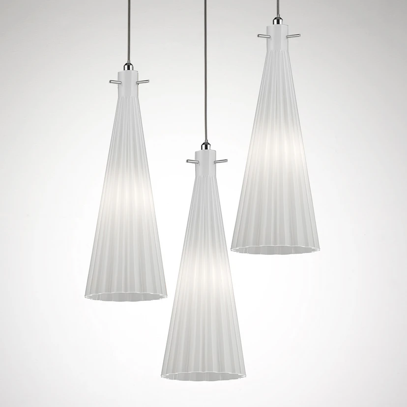 Die Leuchte besteht aus drei trichterförmigen Schirmen aus mundgeblasenem Glas. Das Glas blendet das Licht der Leuchtmittel ab und sorgt mit der geriffelten Beschaffenheit für ein ansprechendes Lichtspiel. Die Schirme sind an einem runden Baldachin aus Metall angebracht und hängen auf verschiedenen Höhen, wodurch der Pendelleuchte eine interessante Asymmetrie verliehen wird.