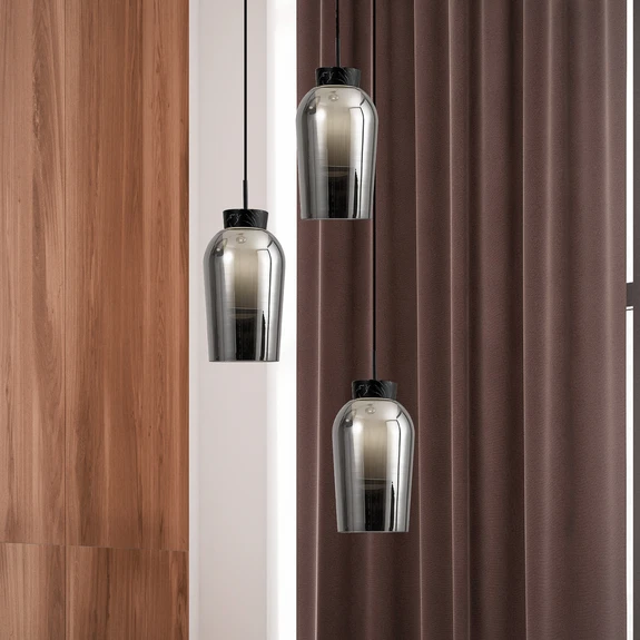 Vom runden Baldachin der Hängeleuchte Nora hängen an drei kleinen Auslegern die in aus zwei Lagen Glas bestehenden Schirme ab. In den durchsichtigen äußeren Schirmen wurden konisch geformte Innenschirme aus satiniertem Glas integriert, die für eine homogene Verteilung des abstrahlenden Lichts sorgen und gleichzeitig den Schirmen eine besondere Wirkung verleihen. Die dreiflammige Leuchte ist eine effektvolle Lichtquelle für den Esstisch oder auch für den Wohnbereich. In den Schirmen wurden E27-Fassungen verbaut, die mit LED-Leuchtmitteln nach Wahl (max. 20 W) bestückt werden können.