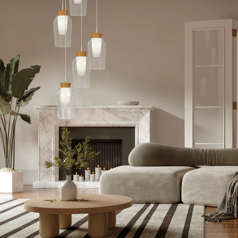 Fünfflammige Hängeleuchte Nora mit Doppelschirmen aus Glas