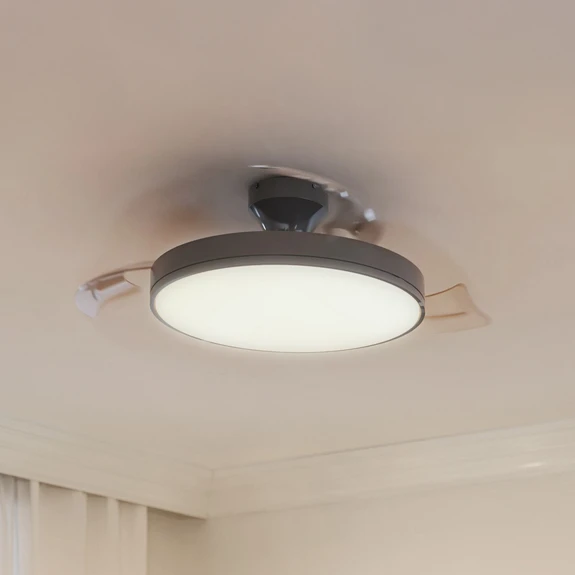 Mit den drei SceneSwitch-Lampeneinstellungen kann in jedem Raum die perfekte Atmosphäre gschaffen werden. Auch über den vorhandenen Lichtschalter lässt sich das Licht in die drei verschiedenen Lichtfarben (2.700 K, 4.000 K oder 5.500 K) einstellen. Wenn die Lampe nicht in Betrieb ist, sind die transparenten Flügel eingeklappt und nicht zu sehen. Inklusive Fernbedienung.