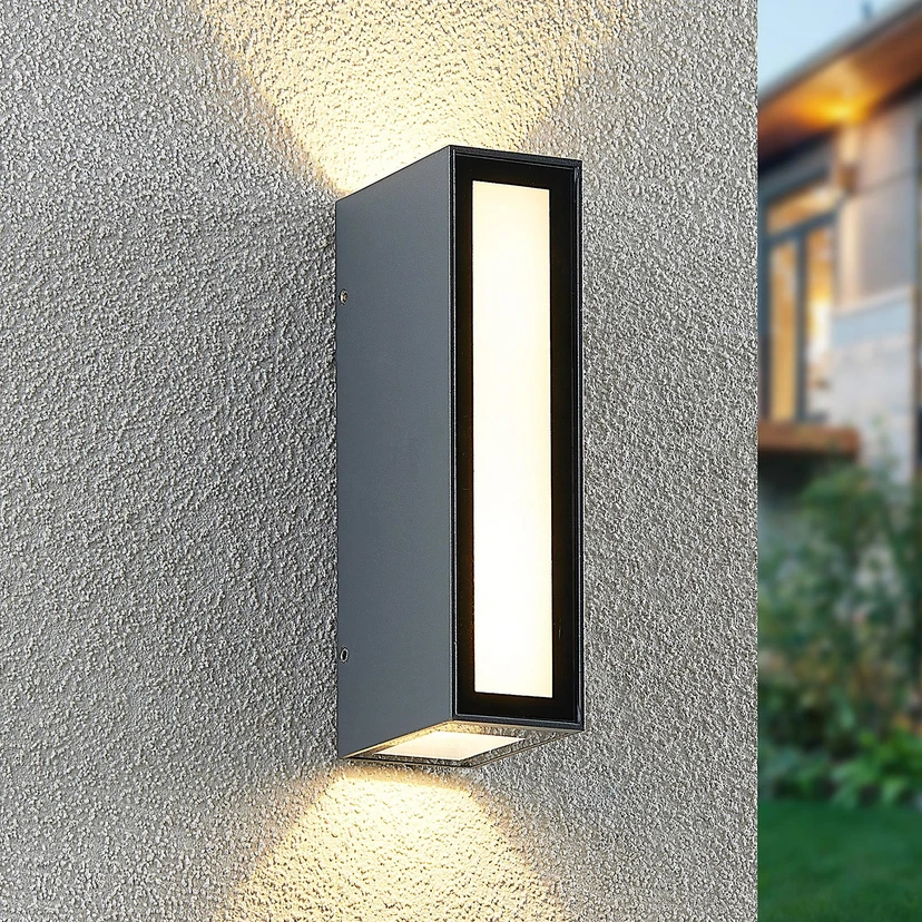 Die LED-Außenwandleuchte Loriava hebt sich von ihrer Umgebung stilvoll hervor, denn sie besitzt ein unverwechselbares Design. Das eckige Gehäuse aus Aluminiumdruckguss wurde mit einem dunkelgrauen Oberflächenfinish verarbeitet und kommt in einem modern gestalteten Umfeld besonders gut zur Geltung. Diese Leuchte spendet einen warmweißen Lichtschein, der angenehm fürs Auge ist und dabei in unterschiedliche Abstrahlrichtungen verteilt wird, ohne dabei zu blenden. Loriava ist eine attraktive Lichtlösung für die Hauswand und kann auch in einer Reihe zu mehreren Leuchten installiert werden.