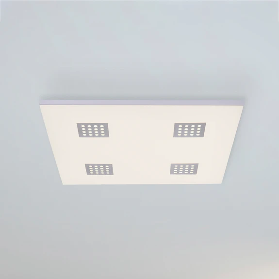 Die große, flache LED-Deckenleuchte Pure-Neo beleuchtet hell und variabel auch große Räume und lässt sich bequem über die mitgelieferte Fernbedienung steuern. Das Panel besteht aus Aluminium und PMMA und ist mit getrennt schaltbaren LED-Boards ausgestattet - die vier Boards hinter den gelochten Alu-Abdeckungen und das Board hinter der satinierten Fläche lassen sich getrennt voneinander schalten. Über die Fernbedienung kann die Lichtfarbe im Bereich von warmweißem bis zu universalweißem Licht ausgewählt werden. Die Helligkeit lässt sich stufenlos dimmen, außerdem kann man auswählen, ob nur die Fläche, die vier Lichtpunkte in der Mitte oder beide zusammen leuchten sollen. Zudem ist es möglich, eine Timerfunktion einzustellen und ein Nachtlicht auszuwählen.