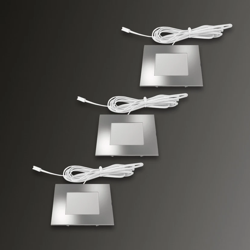 Stimmungsvolle Akzentbeleuchtung im gesamten Wohnbereich garantiert die LED-Einbauleuchte FQ 68-LED in Edelstahl-Optik. Sie wird im 3er-Set geliefert und bietet homogenes Flächenlicht (3.000 K) mit behaglicher Lichtwirkung. Inklusive Anschlussleitung (2,5 m) mit LED 24-Stecker. Mit Trafo ausgestattet.