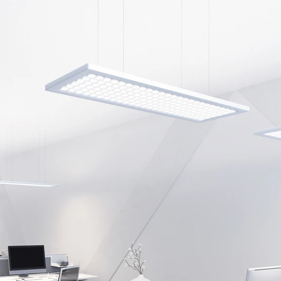 Dime ist eine leistungsstarke LED-Pendelleuchte in schlichter, weißer Rechteck-Form, die sich ideal als Lichtquelle für Büroräume eignet. Sie ist mit der quadratischen Kollimatoroptik "Square Optics" ausgestattet, die gleichzeitig flächiges und gerichtetes Licht ohne Mehrfachschatten bewirkt. Als Lichtquelle ist ein zertifiziertes MINERGIE®-Modul von Regent verbaut.
