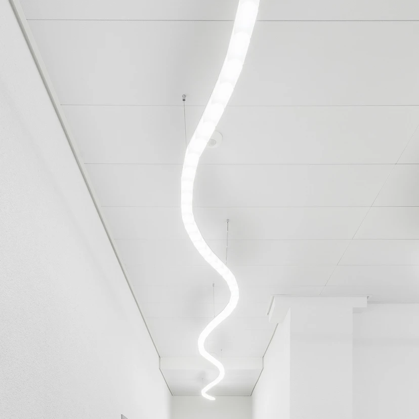 Mit dieser Lichtleiste, sowohl an der Decke als auch an der Wand montiert werden kann, lässt sich jede Räumlichkeit effektiv und zugleich abwechslungsreich illuminieren. Das Besondere an Wiggle: Sie besteht aus gegeneinander drehbaren Elementen, die so montiert werden können, dass sie entweder eine gerade Linie oder schwungvolle Kurven ergeben. Das Licht wird direkt in den Raum abgegeben. Das erforderliche, extern DALI-dimmbare Betriebsgerät ist bereits in der Lieferung enthalten. Die Verwendung als Pendelleuchte ist mit einem separat erhältlichen Abhängeset möglich (siehe Zubehör).