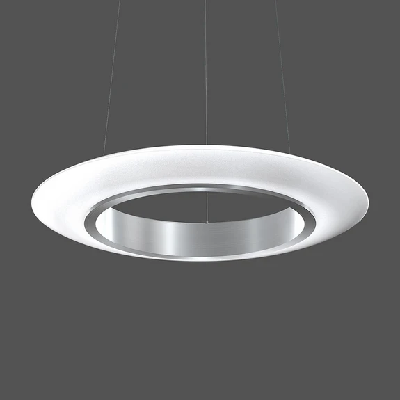 Diese Pendelleuchte besticht mit ihrem eleganten Ring-Design, das ideal mit modern konzipierten Empfangs-, Durchgangs- und Aufenthaltsbereichen harmoniert. Der elliptisch abgeflachte, umlaufende Diffusor besteht aus seidenmattem, mundgeblasenem Opalglas und wird von einem inneren Ring aus Aluminium in natürlich eloxierter Oberfläche gehalten. Die integrierten LEDs sind über eine DALI-Schnittstelle extern steuerbar.