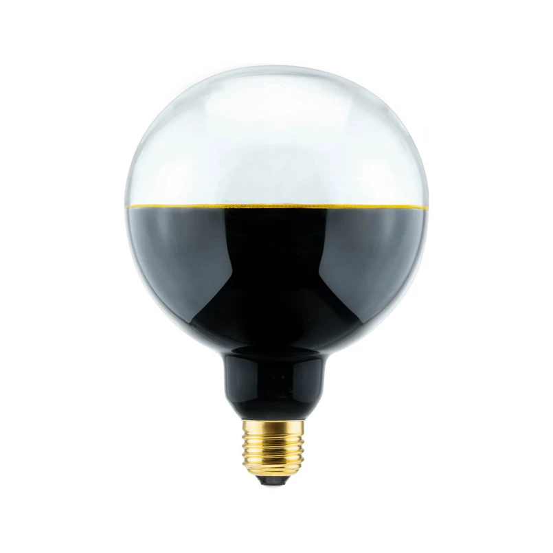 Dieses E27-LED-Leuchtmittel in 12,5 cm großer Globeform aus der Illusion Serie ist mit einem Glaskolben ausgestattet, der jeweils zur Hälfte klar beziehungsweise schwarz gestaltet ist. Hinzu kommt ein goldfarbener E27-Sockel aus Metall.
