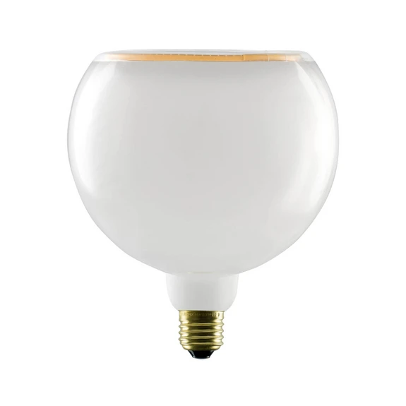 Dieses E27-LED-Leuchtmittel aus der Floating Serie ist mit einem weißen Glaskolben in großer G150 Globeform versehen, der am gegenüberliegenden Ende zum Sockel offen ist. An der ringförmigen Öffnung sind die Dioden integriert. Der E27-Sockel aus Metall ist im Goldfinish gehalten.