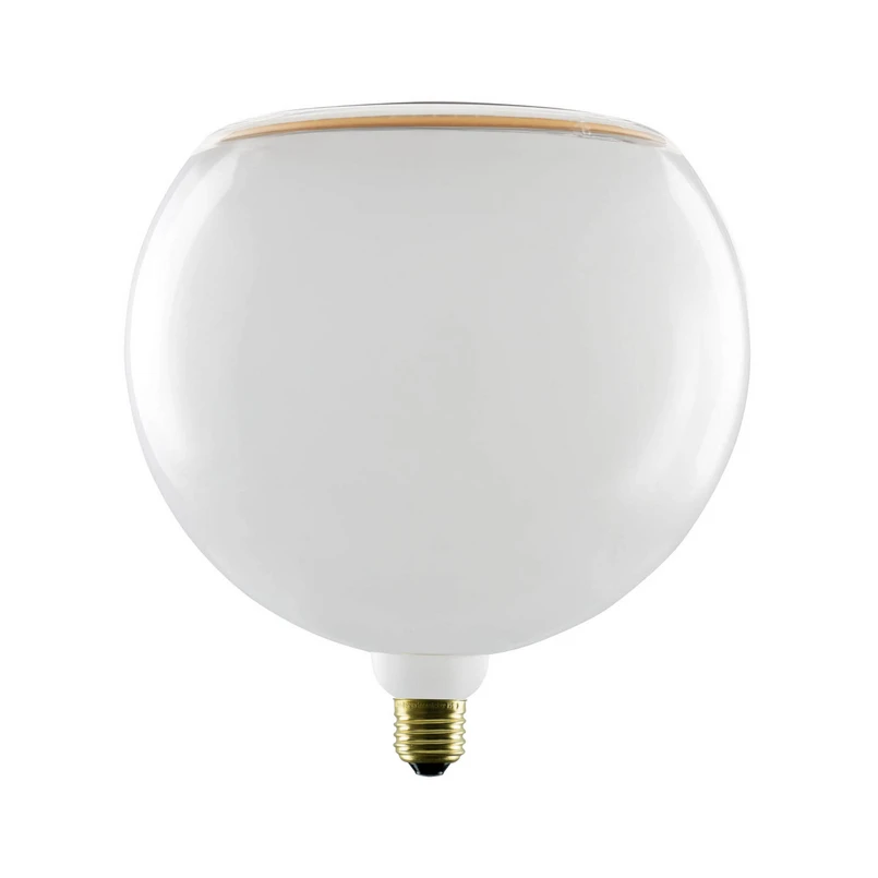 Dieses E27-LED-Leuchtmittel aus der Floating Serie ist mit einem weißen Glaskolben in großer G200 Globeform versehen, der am gegenüberliegenden Ende zum Sockel offen ist. An der ringförmigen Öffnung sind die Dioden integriert. Der E27-Sockel aus Metall ist im Goldfinish gehalten.