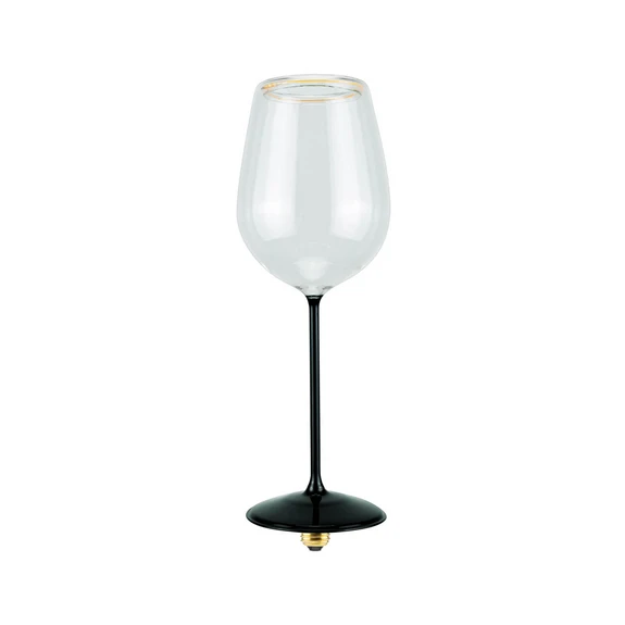 Dieses E27-LED-Leuchtmittel aus der Floating Serie ist mit einem klaren Glaskolben samt schwarzem Stiel versehen, dessen Form einem Rotweinglas nachempfunden ist. Hinzu kommt ein goldfarbener E27-Sockel aus Metall.