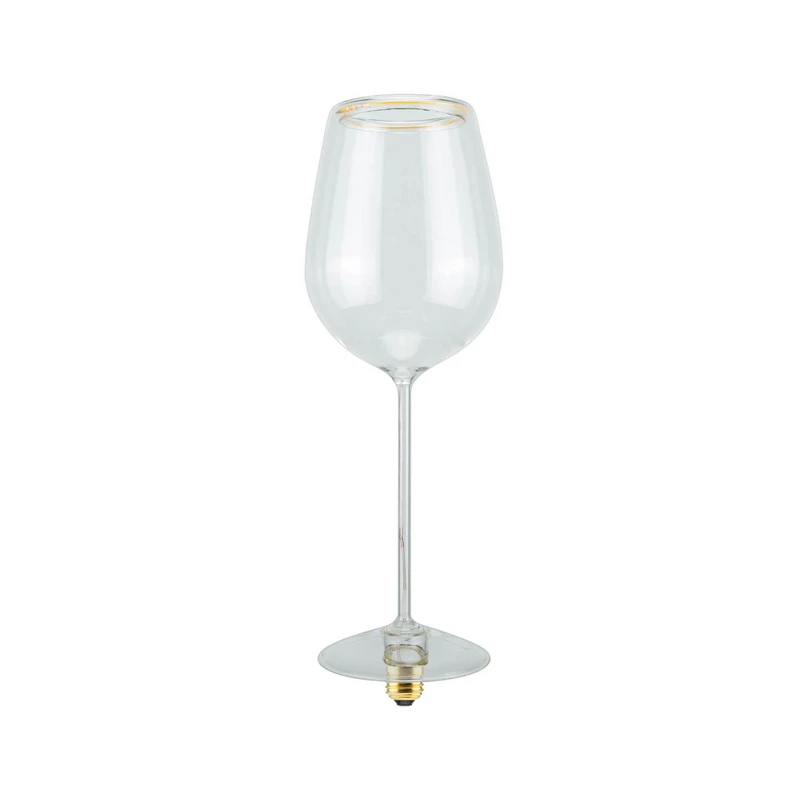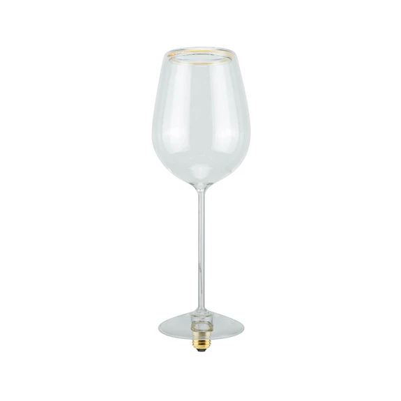 Dieses E27-LED-Leuchtmittel aus der Floating Serie ist mit einem klaren Glaskolben versehen, dessen Form einem Rotweinglas nachempfunden ist. Hinzu kommt ein goldfarbener E27-Sockel aus Metall.