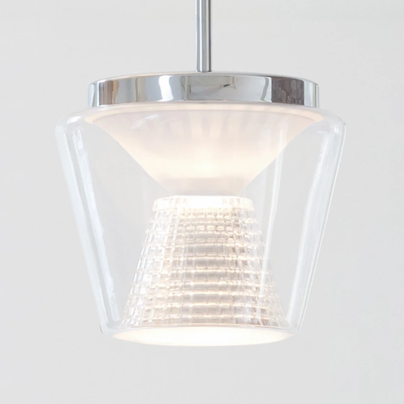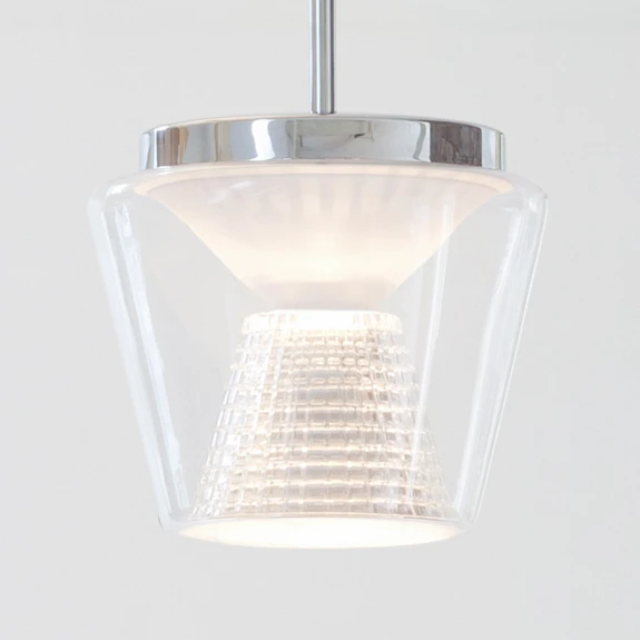 Die Pendelleuchte Annex nach einem Entwurf von Prof. Uwe Fischer strahlt ein Licht mit faszinierender Wirkung aus, das durch den polierten Innenreflektor hauptsächlich nach unten abgegeben wird. Der Außenschirm der Leuchte ist in Kegelform aus klarem, mundgeblasenem Glas gefertigt und umgibt den polierten Aluminiumreflektor, der die Form des Außenschirms spiegelt. Diese besondere Symbiose aus Licht und Form macht die LED-Hängeleuchte Annex zu einem Lichtspender, der gleichermaßen im privaten Wohnraum wie auch in vielen gewerblichen Objekten perfekt zur Geltung kommt. Die moderne LED-Technik ist in einem Gehäuse aus glänzend weiß lackiertem Aluminium untergebracht. Sie garantiert eine sehr gute Farbwiedergabe, Energieeffizienz und lange Lebensdauer; selbst wenn nach vielen Jahren die Lebensdauer der LEDs ihr Ende erreicht hat, lässt sich die Lichtquelle durch ein patentiertes System austauschen. Der Schirm der Hängeleuchte ist mit einem Bajonettverschluss (werkzeugloses Handling) am verchromten Stahlrohr angebracht, welches die Verbindung zum Baldachin aus poliertem Aluminium herstellt.