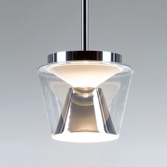 Mit dem Reflektor im Innern des mundgeblasenen, transparenten Kegelschirms aus Glas werden differenzierte Lichtwirkungen erzielt. Die Hängeleuchte ist vielseitig einsetzbar und besonders für hohe Räume geeignet. Im privaten Wohn- oder Esszimmer lässt sie sich ebenso gut nutzen wie in gewerblichen oder gastronomischen Räumlichkeiten. Sowohl der transparente Außenschirm als auch der innere Reflektor der Hängeleuchte sind kegelförmig gestaltet, wobei der Reflektor im Innern die Orientierung des Außenschirms spiegelt.