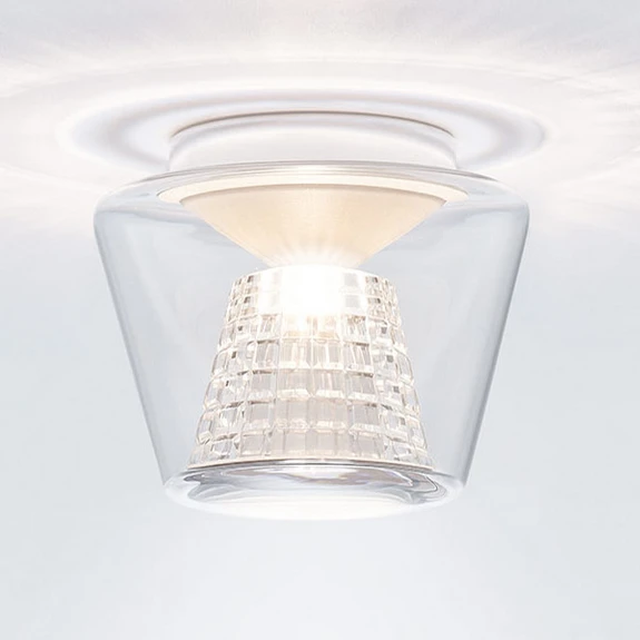 Konische Formen spielen bei Annex eine ganz große Rolle. Ausgehend von einem kegelförmigen, lichtdurchlässigen Silikonformteil wird das Licht der LEDs gleichmäßig in Richtung des Reflektors abgestrahlt, der bei dieser Variante von Annex aus facettiertem Kristallglas besteht, das wie geschaffen dafür ist, beeindruckende Lichteffekte im Raum zu erzeugen. Sowohl der Kristallglasreflektor wie auch die äußere Hülle aus mundgeblasenem, klarem Glas sind konisch geformt.
