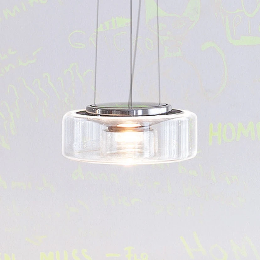 Der feine, klare Glaskörper in flacher Zylinderform ist mundgeblasen. Das Gehäuse der LED-Einheit besteht, ebenso wie der Baldachin, aus poliertem Aluminium. Die Aufhängung erfolgt mittels schlanker Stahlseile, deren Länge bei der Montage angepasst werden kann. Der Glasschirm ist zur Reinigung in der Spülmaschine geeignet; er lässt sich dank eines Bajonettverschlusses werkzeuglos abnehmen und befestigen. Die LED-Einheit kann bei Defekt oder am Ende der Lebensdauer ausgetauscht werden.