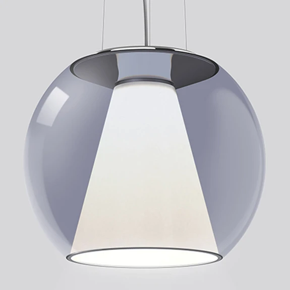 Die LED-Hängeleuchte Draft ist ein Objekt von zeitgenössischer Prägnanz. In Anlehnung an eine klassische Kugelleuchte entstand eine Lichtquelle mit perfekt ausbalancierter Lichtwirkung. Im mundgeblasenen Glasschirm ist ein konischer Reflektor platziert, dessen opales Polycarbonat einerseits einen optischen Kontrast zum durchsichtigen Glas bildet und andererseits die Lichtwirkung entscheidend beeinflusst. So wird ringum eine weich gestreute Grundbeleuchtung erzielt. Beispielsweise ein unterhalb gelegener Tisch wird mit direktem Licht versorgt, wobei eine Diffusorscheibe ebenfalls eine gleichmäßige Lichtstreuung bewirkt. Die in der Leuchteinheit mit glänzendem Aluminiumgehäuse integrierten LEDs sorgen für eine sehr gute Wiedergabe der Farben in der Umgebung. Die Stahlseilabhängung lässt sich werkzeuglos ausrichten und die LED-Einheit ist dank eines patentierten Systems austauschbar.