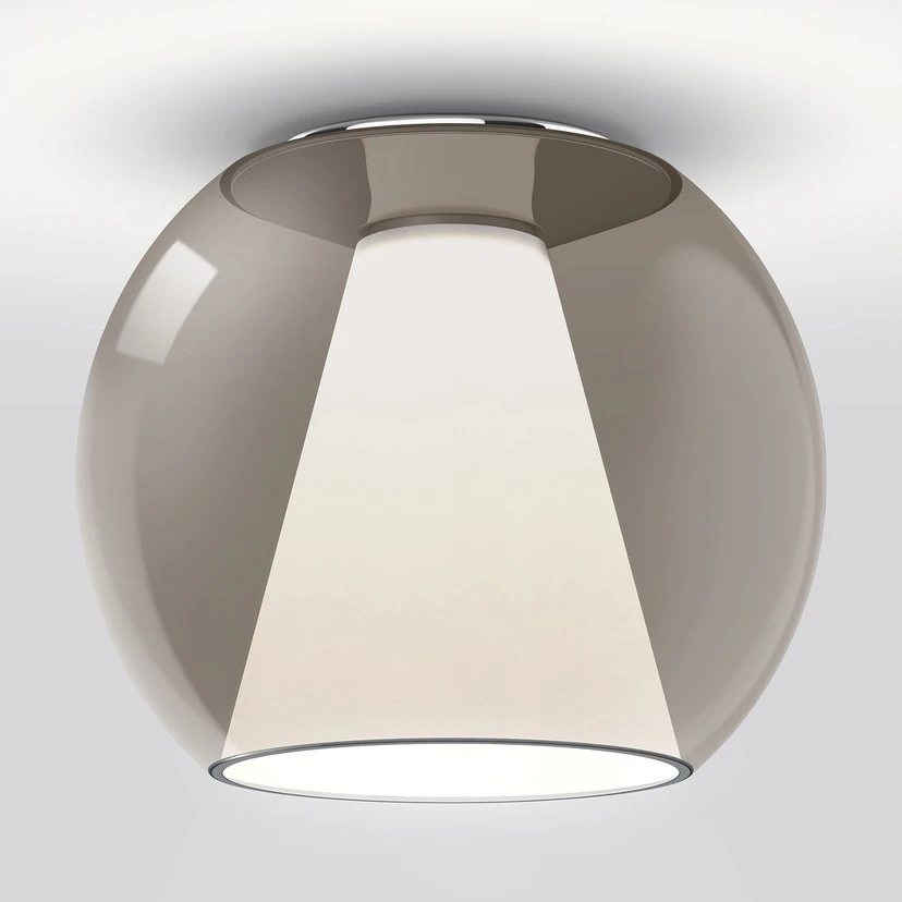 Mit der LED-Deckenleuchte Draft wird aus der archetypischen Kugelleuchte ein Objekt von zeitgenössischer Prägnanz und perfekt ausbalancierter Lichtwirkung. Die Kugel aus transparentem, mundgeblasenem Glas und der lichtstreuende, opale Innenreflektor treten in einen spannenden Kontrast. Die LED-Lichtquelle sitzt tief im Inneren des konischen Innenreflektors und sorgt rundum für weich gestreutes Raumlicht sowie ein gerichtetes Direktlicht nach unten. Eine Diffusorscheibe am unteren Abschluss gewährleistet einen besonders weichen Lichtaustritt und gleichmäßig beleuchtete Flächen.