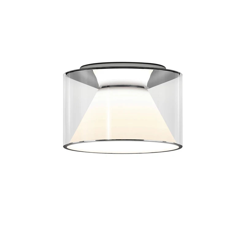 Optisch definiert sich Drum als Spiel geometrischer Formen, das besonders geeignet ist, geradlinige Architektur zu akzentuieren. Der zylindrische Schirm aus mundgeblasenem Glas beherbergt einen aus Polycarbonat bestehenden Kegelstumpf als Innenreflektor, der sich in der glänzenden Oberfläche der aus Aluminium produzierten Leuchteinheit spiegelt. Gleichzeitig bewirkt der Reflektor eine sanfte Lichtstreuung ringsum sowie ein nach unten gerichtetes Direktlicht.