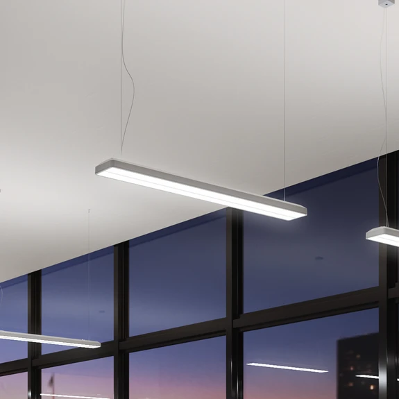 Durch die primäre Entblendung mittels eines Mikrorasters errzielt die LED-Hängeleuchte Taris ein blendfreies Licht mit einem Entblendungsindex von UGR 19, so dass sie sich perfekt zum Einsatz in Büroräumen mit Bildschirmarbeitsplätzen eignet. Die Hängeleuchte besteht aus Kunststoff, die primäre Lichttechnische Abdeckung aus einer Axiallinse aus PMMA mit strukturierter Oberfläche. Das universalweiße Licht der LEDs wird symmetrisch sowohl nach oben zur indirekten, allemeinen Raumbeleuchtung als auch nach unten abgestrahlt, wo es z. B. den Schreibtisch direkt beleuchtet. So entsteht eine sehr angenehme Beleuchtung im Büro oder in vielen weiteren Bereichen mit Bildschirmarbeitsplatz. Durch die Ausstattung mit einem dimmbaren EVG lässt sich die Leuchte über DALI auch dimmen (nicht enthalten).