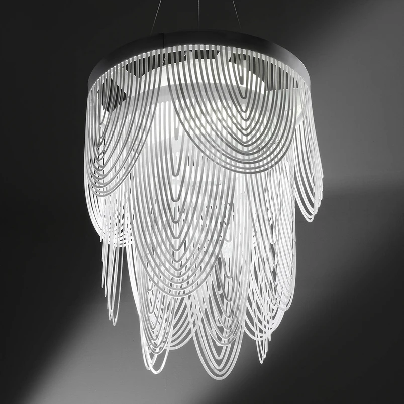 Die Hängeleuchte Ceremony ist eine prunkvolle Hymne an die Femininität. Ihre Gestaltung aus vielen bogenförmigen Elementen wirkt wie einzelne Ketten und erinnert an einen Rock und einen Tanz, an eine Perlenkette oder an die Drapierung eines Wasserfallkragens am Dekolleté. Die Lichtquellen sind in dem Schirm aus einzelnen Technopolymerelementen verteilt und verleihen der Leuchte einen Hauch von Drama und Schwerelosigkeit und eine kraftvolle Präsenz.