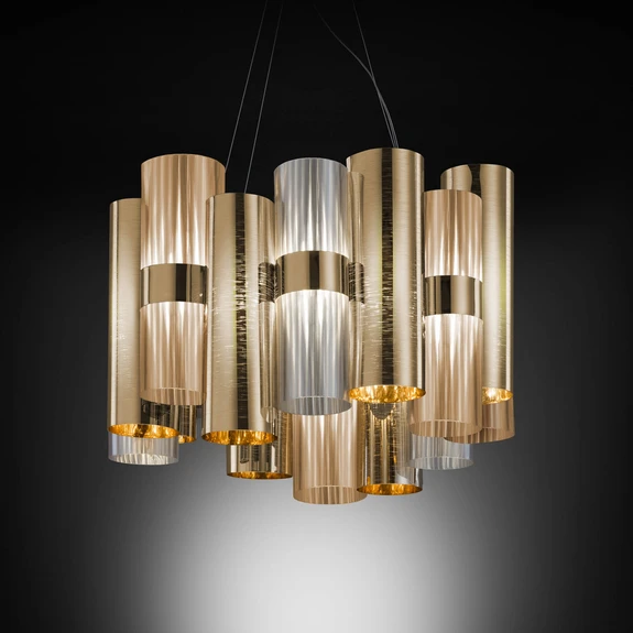Zylinder in unterschiedlichen Größen, Farben und auch aus unterschiedlichen Materialien sind bei der Hängeleuchte La Lollo um einen Ring herum aneinander gereiht. Die unterschiedliche Beschaffenheit der einzelnen Elemente der Leuchte sorgt auch für interessante Lichteffekte und nicht zuletzt für ein glamouröses Ambiente. La Lollo M in der goldenen Ausführung wurde aus dem eigens von Slamp entwickelten Material Brushed Goldflex® hergestellt.