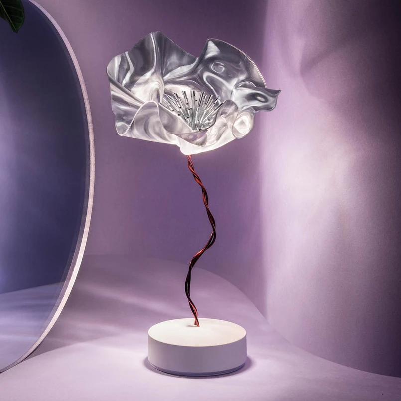 Der Schirm ist von Hand aus dem von Slamp entwickelten transparenten Polymer Lentiflex® als ein nach oben geöffneter, unregelmäßig geschwungener und gefalteter Blütenkelch modelliert, der von einem Stiel aus biegsamem Kupferdraht getragen wird. Die Blütenstempel zerstreuen die Wärme der LEDs und schirmen deren warmweißes Licht ab. Der 5V LiPo-Akku bietet eine Betriebsdauer von 6 Stunden und wird über einen integrierten USB-Anschluss geladen. Zur Steuerung steht ein Touchdimmer am Fuß bereit. Die mitgelieferte Metallscheibe ermöglicht eine Fixierung, sodass Lafleur auch als Wandleuchte verwendet werden kann.