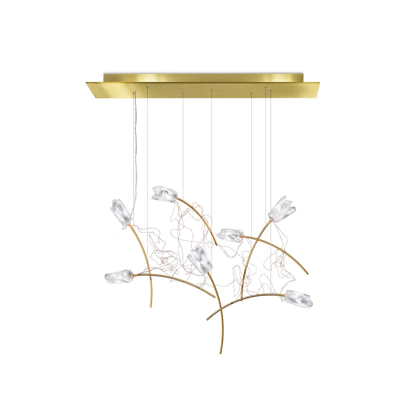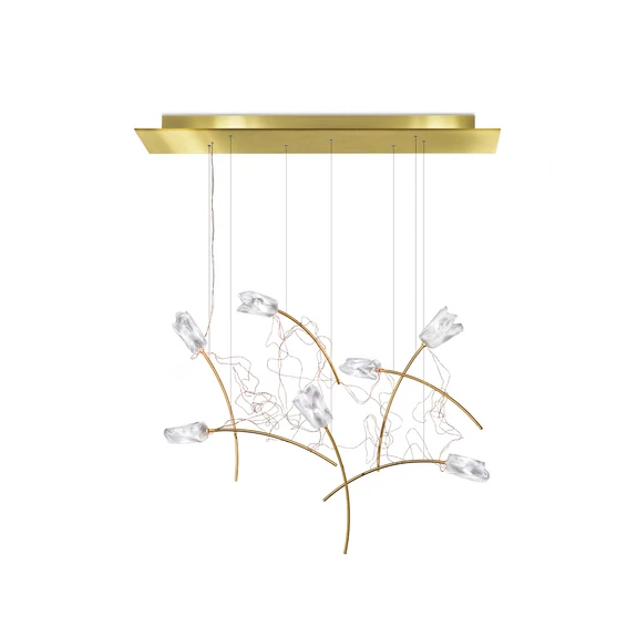 Die siebenflammige Hängeleuchte Tulip wirkt in ihrem Design leicht, elegant und verträumt. Sieben Tulpen mit einer aus Lentiflex® geformten Blütenkrone, die jede Blume zu einem Unikat macht, hängen vom länglich geformten Baldachin ab. Das Technopolymer Lentiflex® ist ein von Slamp eigens entwickelter und patentierter Kunststoff, der sich durch seine Transparenz und seine ganz besondere Lichtwirkung auszeichnet. An fast unsichtbaren Stahlseilen befestigt, wirken die Blumen, als würden sie frei schweben. Die unterschiedliche Neigung jede einzelnen Tulpe verstärkt das natürliche Aussehen, die einzelnen Blumen untereinander sind mit dünnen Kupferdraht verbunden, durch den die Elektrizität in Niedervoltspannung fließt.