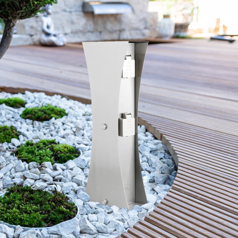 Steckdosen werden im Außenbereich für vielerlei elektrische Geräte - Gartenschere, Rasenmäher etc. - sowie für Leuchten benötigt. Die Steckdosensäule Connect bietet vier Steckdosen, die jeweils mit einem Klappdeckel verschlossen sind. Das formschöne Design wird ergänzt durch die Wahl eines robusten Materials (Edelstahl).
