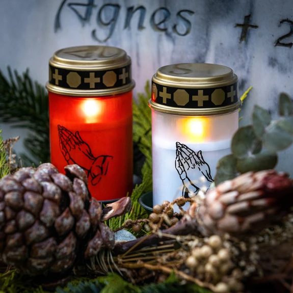 Dieses Grablicht für den Außenbereich (IP44) ist mit einer LED-Lichtquelle bestückt, die ein flackerndes Licht ähnlich einer Kerzenflamme erzeugt. Der Betrieb erfolgt mit zwei LR14-Batterien, die im integrierten Batteriefach Platz finden.
