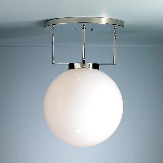 Die Deckenleuchte ist eine Neuauflage nach Marianne Brandt, die die Vorlage 1926 am Weimarer Bauhaus schuf. Puristisches Design trifft mit dem kugelförmigen Lampenschirm aus weißem Opalglas auf die außergewöhnliche dreifache Aufhängung. Diese wurde im Gegensatz zum ursprünglichen Modell aus vernickeltem Metall hergestellt; das beim Original verwendete Aluminium ist anfälliger und somit weniger langlebig. Die Deckenleuchte kann in vier verschiedenen Ausfertigungen bestellt werden: Die Größe von Kugel und Baldachin kann ganz nach Vorliebe gewählt werden.