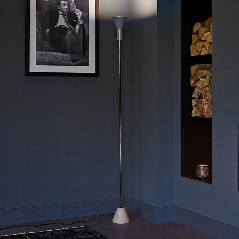 Mit der LED-Stehleuchte Gru ist dem Designer Egon Eiermann ein modernes, aber gleichzeitig auch retrospektivisches Beleuchtungsobjekt gelungen, das nicht nur durch seine Optik überzeugt, sondern auch durch die verbaute Technik. Durch das grazile, puristisch gestaltete Leuchtengestell, das sich aus einem kegelförmigen Leuchtenfuß, einem schmalen, verchromten Metallstab und einem ebenso kegelförmigen Schirm zusammensetzt, der das Licht nach oben an die Decke strahlen lässt, wirkt sie gleichermaßen modern wie auch klassisch. So fügt sie sich in jegliche Raumgestaltung harmonisch ein und erzeugt eine tolle, indirekte Beleuchtung. Über den am Leuchtenkopf integrierten Drehdimmer lässt sich die Helligkeit beliebig bestimmen.