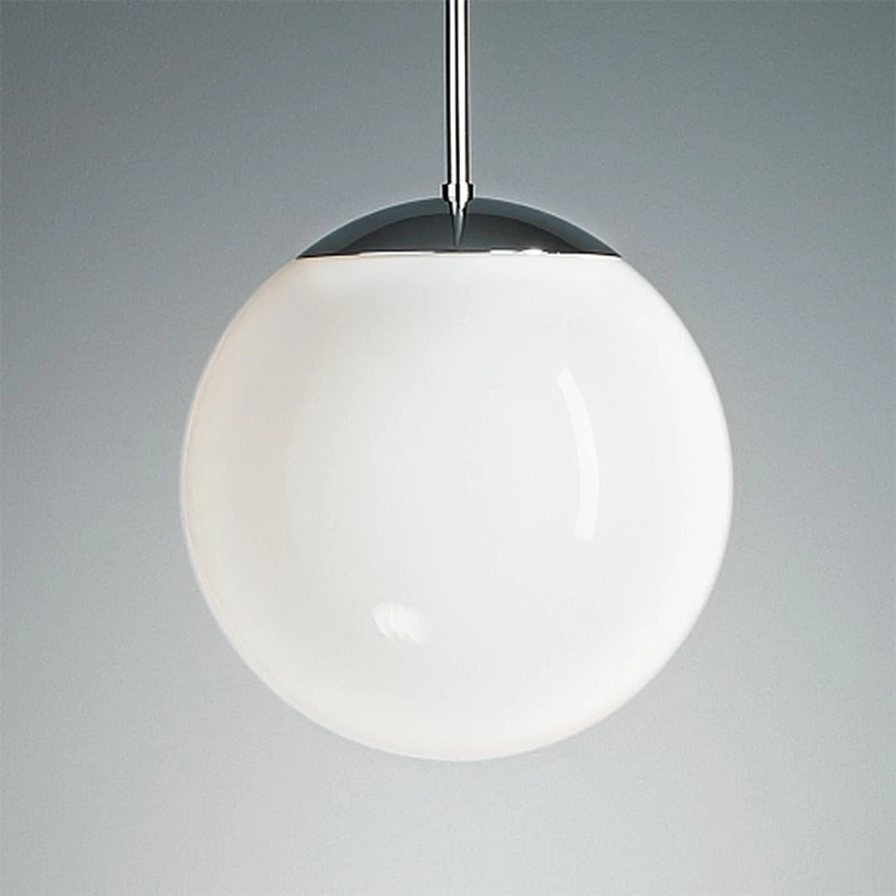 Diese Pendelleuchte wurde in Deutschland um das Jahr 1900 entworfen. Damals entstand ein Konzept, welches heute wie vor über 100 Jahren zu begeistern weiß. Die Leuchte besteht aus einer Abhängung aus wahlweise verchromtem Metall oder Messing, welches in einen kleinen Teil der opal überfangenen Glaskugel übergeht. Diese Kombination gestaltet sich als überaus elegant. Zudem ist dem Besitzer gewiss, dass er ein Stück deutsche Geschichte nach Originalentwurf in seine Räumlichkeiten integrieren kann.