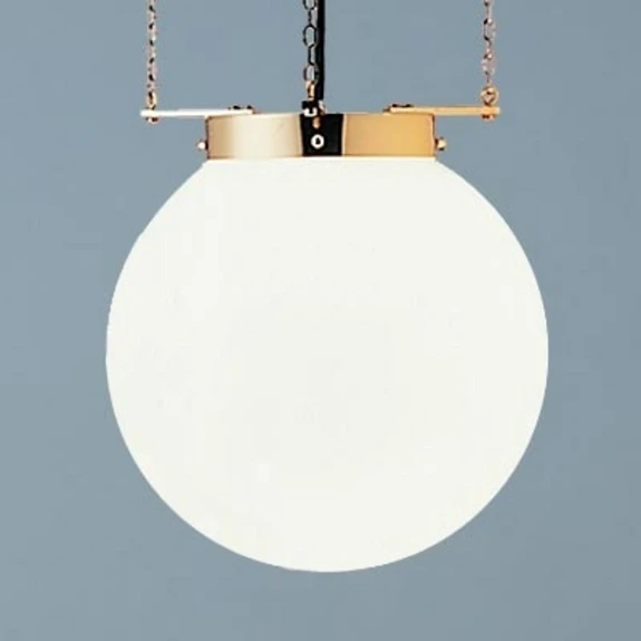 Das Design dieser Hängeleuchte im Bauhaus-Stil wurde 1928 von Marianne Brandt entworfen, einer der bekanntesten deutschen Designerinnen des Bauhaus. Es stellt eine Variation ihres Entwurfes einer Deckenleuchte mit drei Stäben dar und präsentiert sich nunmehr mit drei Ketten (Länge immer 100 cm). Auch in dieser Neuinterpretation des Klassikers von 1926 überzeugt das Design bedingungslos mit seiner mehrfachen Aufhängung und seiner schlichten, aber wirkungsvollen Opalglaskugel, die gemeinsam mit den übrigen Komponenten perfekt dem Bauhaus-Stil entspricht.