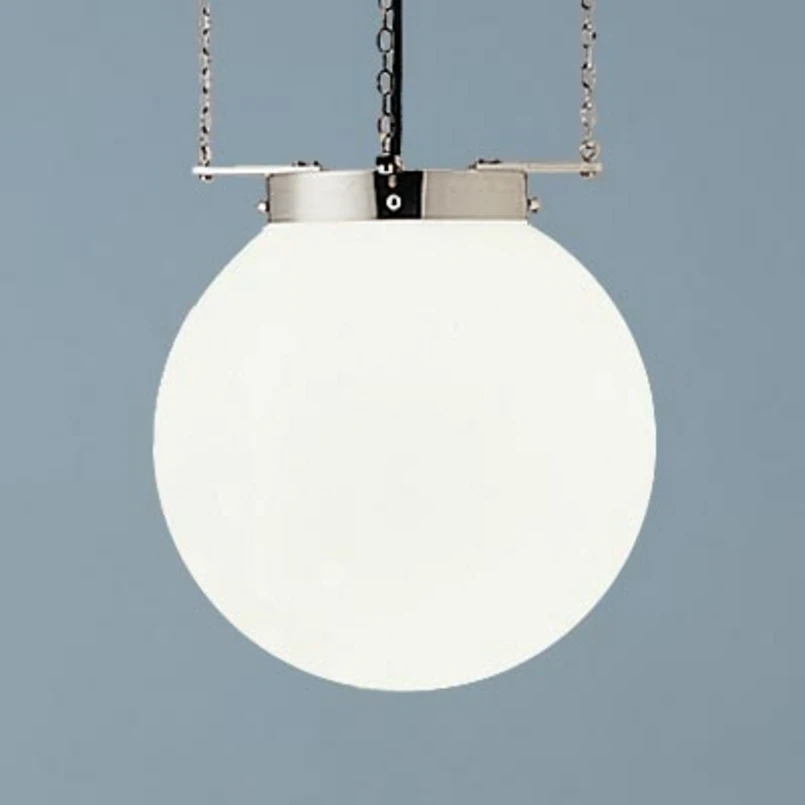 Das Design dieser Hängeleuchte im Bauhaus-Stil wurde 1928 von Marianne Brandt entworfen, einer der bekanntesten deutschen Designerinnen des Bauhaus. Es stellt eine Variation ihres Entwurfes einer Deckenleuchte mit drei Stäben dar und präsentiert sich nunmehr mit drei Ketten (Länge immer 100 cm). Auch in dieser Neuinterpretation des Klassikers von 1926 überzeugt das Design bedingungslos mit seiner mehrfachen Aufhängung und seiner schlichten, aber wirkungsvollen Opalglaskugel, die gemeinsam mit den übrigen Komponenten perfekt dem Bauhaus-Stil entspricht.