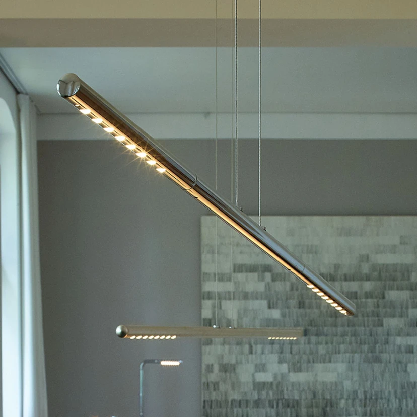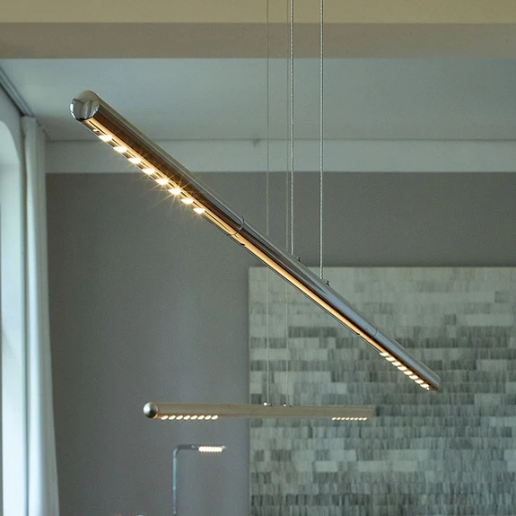 Die Hängeleuchte LUM vereint klassisches Bauhaus-Design mit moderner Technik, die einen hohen Bedienkomfort gewährleistet. Die Rohrenden der Hängeleuchte lassen sich um 360° drehen, so dass die Leuchtrichtung der LEDs beliebig verändert werden kann. Das Ein- und Ausschalten sowie das Dimmen der einzelnen Leuchteinheiten erfolgt über den integrierten Sensordimmer am Rohr. Außerdem kann man die Abhängung der Leuchte durch sanftes Anheben oder Ziehen von 40 bis 175 cm variieren.