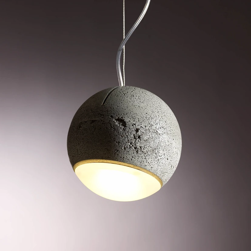 Die von dem Designer Joachim Manz erschaffene Pendelleuchte Trabant 3 wurde im Jahre 2013 für die deutsche Leuchtenmanufaktur Tecnolumen entworfen. Die Leuchte besticht nicht nur durch das verwendete Material Beton, sondern auch durch die besondere Struktur und Form. Der Designer hat sich bewusst für eine handgefertigte Betonkugel entschieden, um den Look eines Himmelskörpers zu verdeutlichen. Die Oberfläche der Leuchte ist aufgrund des Handgusses mit unregelmäßigen Lufteinschlüssen besetzt, so dass jede Leuchte zu einem Unikat wird. Auf der Unterseite der Leuchte ist ein Glasschirm befestigt, wodurch das Licht gleichmäßig in den Raum entgleiten kann. Die Pendelleuchte Trabant 3 besitzt einen unverkennbaren Charakter, mit dem sie alle Blicke auf sich zieht.