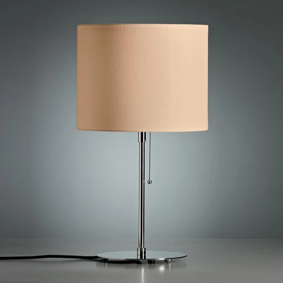 Der Designer dieser Tischleuchte, Walter Schnepel, hat sich intensiv mit der deutschen Leuchtengeschichte auseinandergesetzt und verstanden, welche klassischen Elemente sich mit welchen modernen Materialien kombinieren lassen, um eine edle und begeisternde Wirkung zu erzeugen. Metallfuß und Stab sind vernickelt und wurden mit Elementen versehen, die vom Bauhaus-Stil inspiriert sind. Dazu zählt die schwarze Zugschnur, an der sich ein vernickeltes Kügelchen befindet, ebenso wie das schwarze Zuleitungskabel.