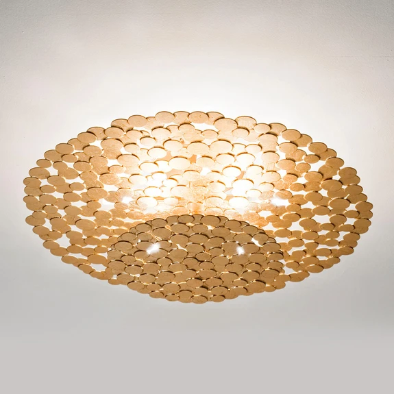 Dieses Schmuckstück besteht aus zahlreichen unterschiedlich großen Metallscheiben, die der Deckenleuchte ihre runde Form geben. Jede einzelne von ihnen wurde von Hand verlötet. Beleuchtet wird die Wandleuchte zum faszinierenden Lichtobjekt. Eine ausdrucksstarke Bereicherung für Wohnräume - aber auch für Restaurants oder Hotelfoyers.