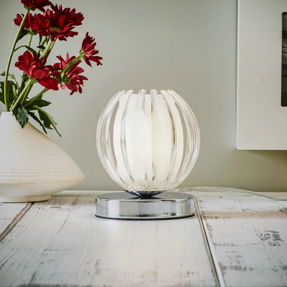 Die kleine Tischleuchte Claw überzeugt durch Design und Funktionalität. Der Lampenschirm, der auf einem chromfarbenen Sockel thront, besteht aus einem Milchglas-Zylinder, der von Blättern aus Acryl umschlossen wird. Diese sorgen bei eingeschaltetem Licht für eine beeindruckende Lichtwirkung. Der Sockel selbst ist berührungsempfindlich und kann durch die integrierte Touchfunktion bei Berührung die Leuchte Claw einschalten, ausschalten und über drei Stufen in der Helligkeit variieren.