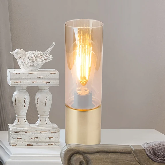 Der Lampenschirm in Zylinderform besticht durch sein amberfarbenes Glas, das einen Blick auf das integrierte Leuchtmittel zulässt. Über den handlichen Touch-Schalter besteht die Möglichkeit, die Lampe schnell ein- oder auszuschalten. Die Tischlampe überrascht dabei vor allem durch ihren matten Messington, der für ein schlichtes und doch elegantes Design sorgt, das überall hervorragend zur Geltung kommt.