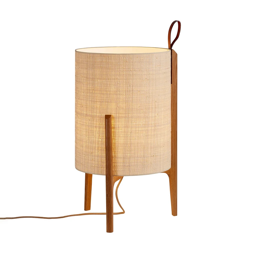 Beim kurzen Dreibein-Gestell kommt Eichenholz zum Einsatz, das mit seiner natürlichen Maserung gefällt. Darauf ist der Schirm angebracht, der die Form eines vertikal offenen Zylinders annimmt. Dieser besteht aus einem naturbeigen Textil, das aus Palmfaser gewebt ist. Eine braune Lederschlaufe animiert dazu, Gretas Standort hin und wieder zu variieren. Die Tischleuchte ist mit einem Steckerkabel und Schalter versehen.