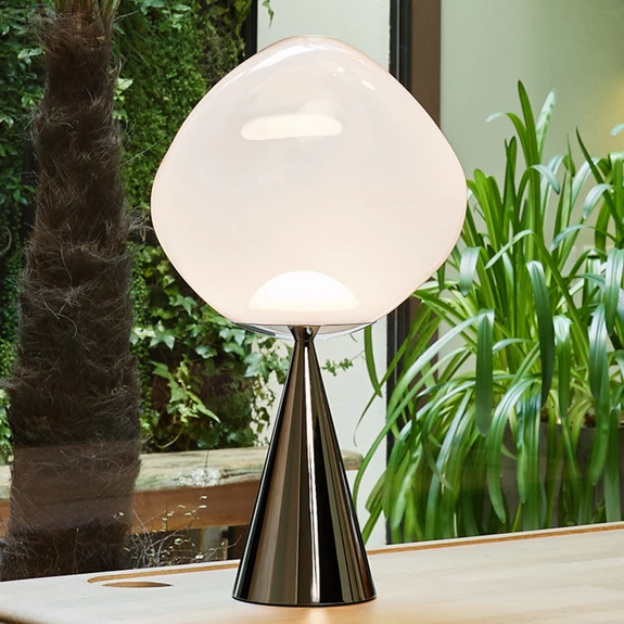 Elegant designte LED-Tischlampe Melt Cone Fat - Schirm opal, Fuß silberfarben