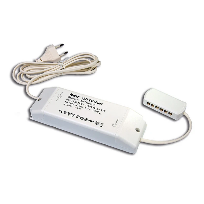 Dieser Trafo eignet sich zur Versorgung von Geräten mit 24V Eingangsspannung, die mit Hera LED 24 Stecker ausgestattet sind. Der Trafo verfügt über einen Stecker zum Anschluss an die Steckdose.