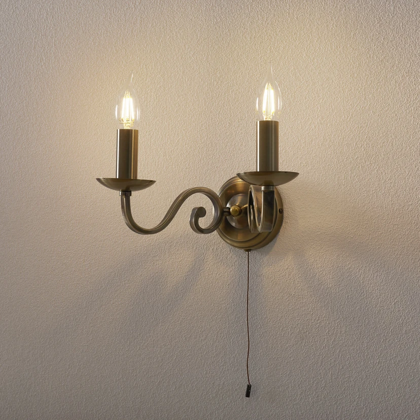 Antikes Messing, elegante Schwünge und ein Zugschalter sorgen für die nostalgische Optik der Wandleuchte Richmond. Sie wird mit zwei Leuchmitteln in Kerzenoptik bestückt, die, zum Beispiel bei Einsatz moderner Filament-Lampen, die echte Kerze geschickt nachahmen. Mittels des kleinen Zugschalters lässt sich die Wandleuchte direkt an- und ausschalten. Richmond ist geeigent für ein atmosphärisches Zusatzlicht im Wohnzimmer, Esszimmer oder auch im Flur.