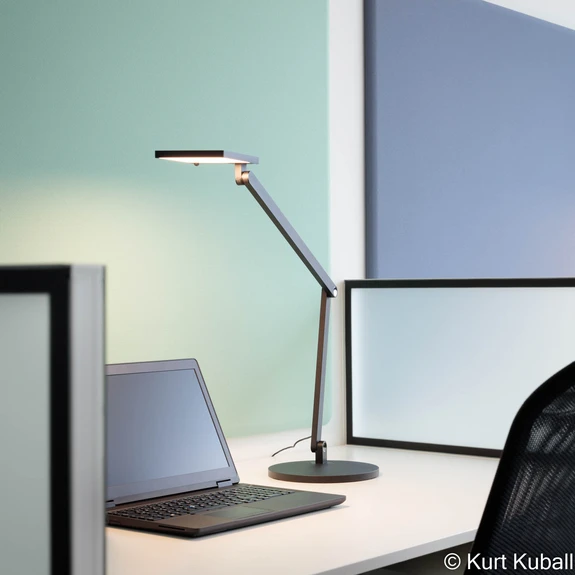 Die Bedienung erfolgt über den an der Oberseite des Kopfs integrierten Touch-Sensor, der mit einem kurzen Wischen oder Tippen das Schalten und mit einem Halten des Fingers das Dimmen ermöglicht. Bei Bedarf kann der an der Unterseite platzierte Präsenzsensor aktiviert werden, der Bewegungen im Erfassungsbereich erkennt. Er schaltet die Leuchte nach 15 min Abwesenheit automatisch aus und bei der Rückkehr an den Arbeitsplatz wieder ein.