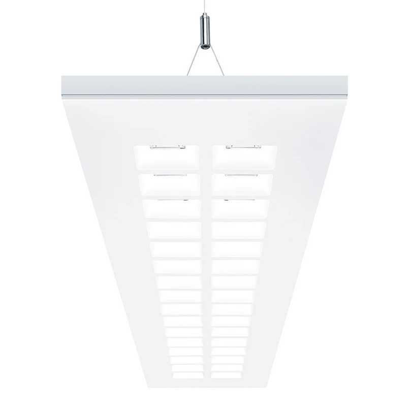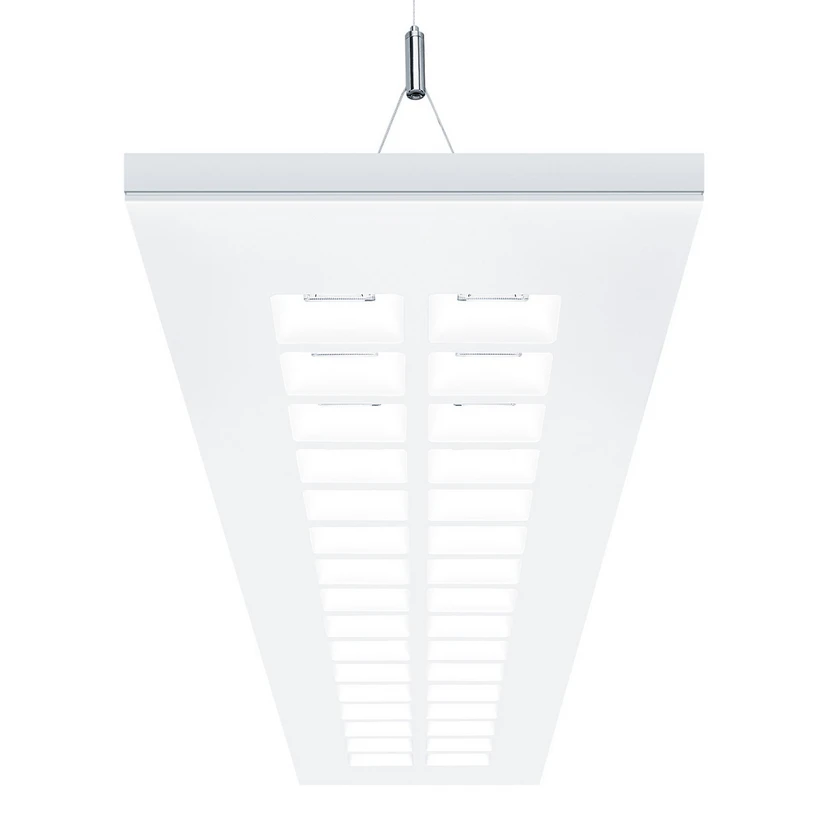 Bei dieser Büro-Pendelleuchte von Zumtobel gehen zeitgemäße Optik und Funktionalität Hand in Hand. Der rechteckige Korpus besteht aus weiß pulverbeschichtetem Stahlblech. Dank der quadratischen Linsenoptik fällt das Licht effizient und blendfrei durch die Öffnungen - ideal zur direkten Arbeitsbeleuchtung. Zudem wirkt ein nach oben ausgestrahlter Anteil als Grundbeleuchtung. Ein Highlight ist die Steuerbarkeit; die Bluetooth-kompatible Leuchte kann bequem per App bedient werden.